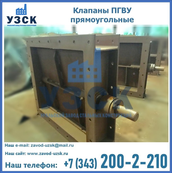 Прямоугольный клапан ПГВУ имеет прямоугольную или квадратную форму, по основному сечению конструкции, на которую устанавливается клапан. Для изготовления шиберов ПГВУ в Люберцах применяются сталь нержавеющая, углеродистая или низколегированная, в зависимости от модели. Внутри клапана имеется запорный элемент, передвигающийся параллельно общему потоку движения среды. Запорный элемент, или створка имеет такую же форму, как и основное сечение. Перемещение створки происходит благодаря возвратно-поступательным движениям.